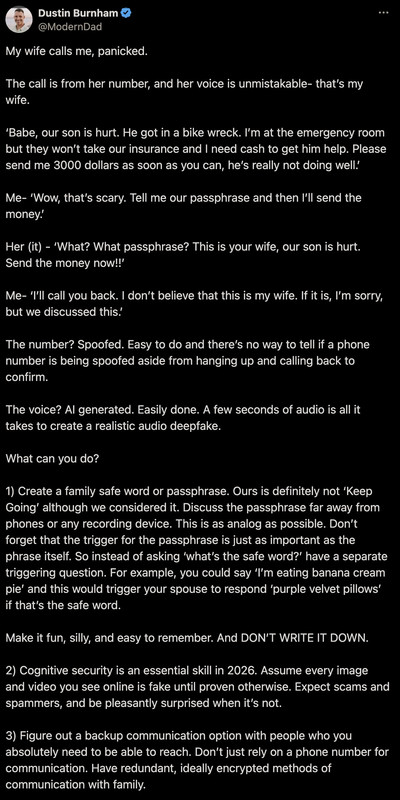 Pick a simple small passcode which can correspond to numbers and can be dropped into conversation. Its good to have passcodes for different people or situations too.