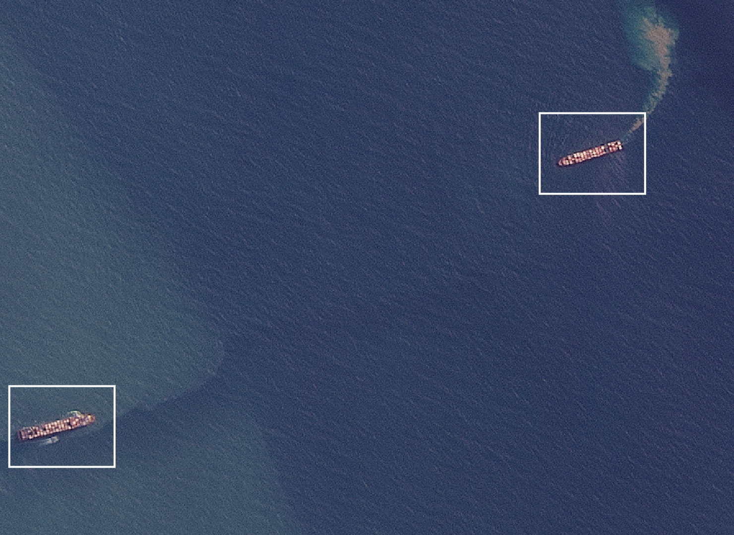 Two cargo ships — the Hamouna (left) and the Shabdis (right) — owned by the Islamic Republic of Iran Shipping Lines pass each other in the ocean off of Gaolan Port in Zhuhai, China, on Feb. 19. (Planet Labs)
