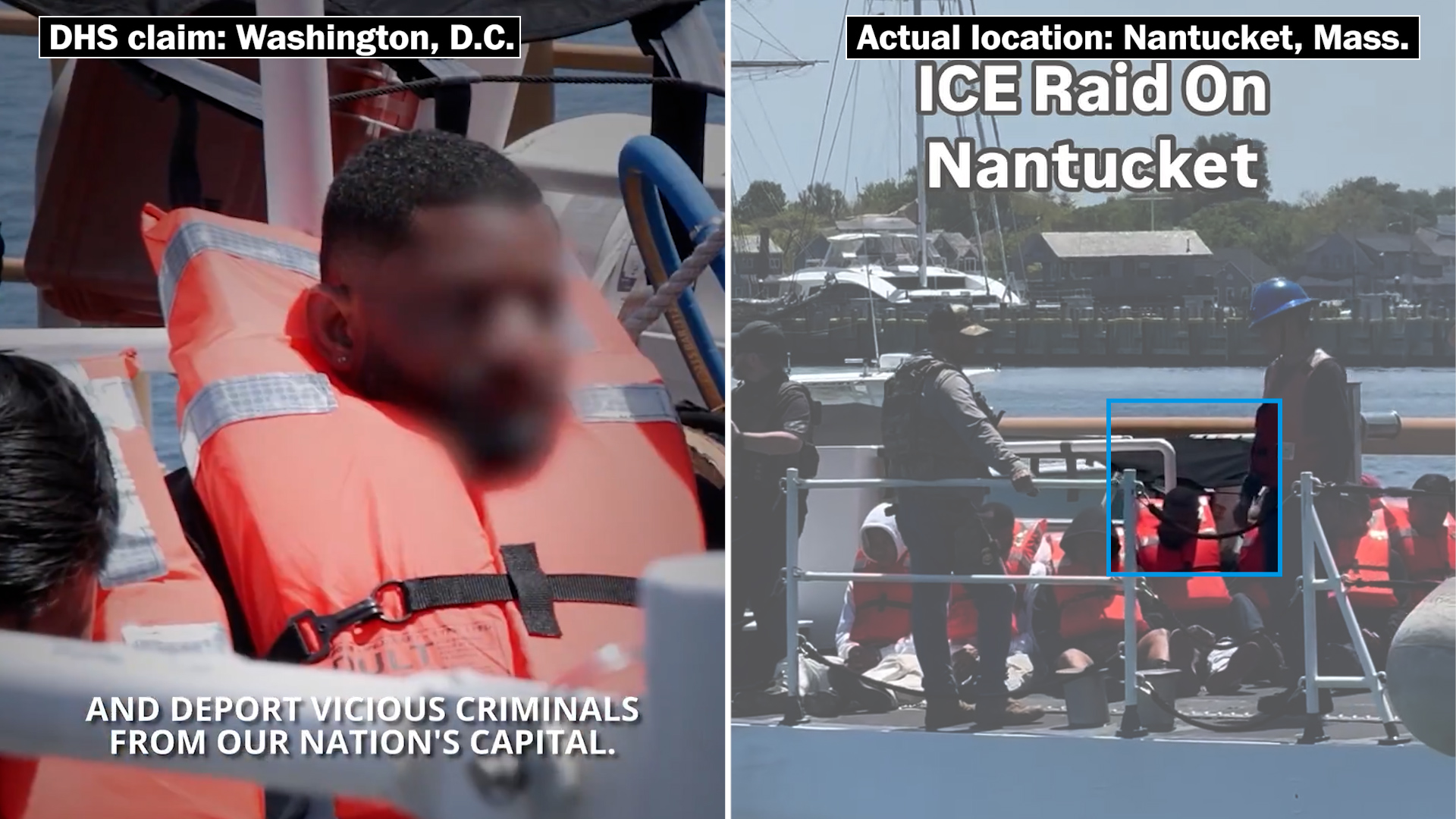 There was one problem. Several of the clips had been recorded during unrelated operations months earlier, in Los Angeles and West Palm Beach, Florida. The officials sound bite about deportations in D.C. played over a clip from May showing detainees on a Coast Guard boat off the coast of Nantucket, the Massachusetts island 400 miles away.