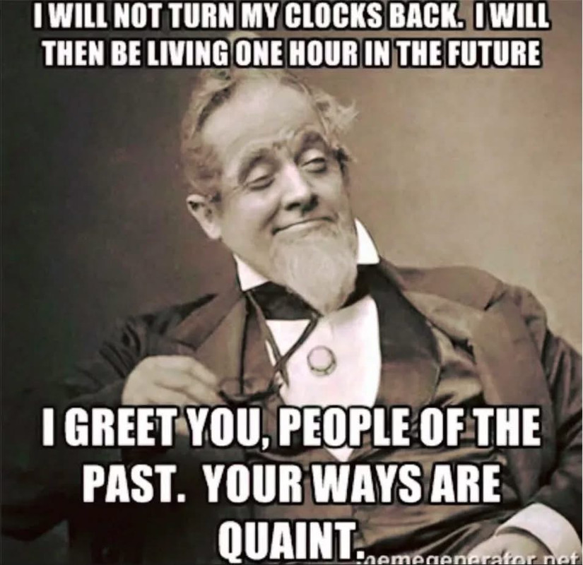 2) I then set the clock ahead ahead eleven hours, instead of turning it back one hour. They both have the same effect, but setting it ahead eleven hours is my way of "sticking it to the man".