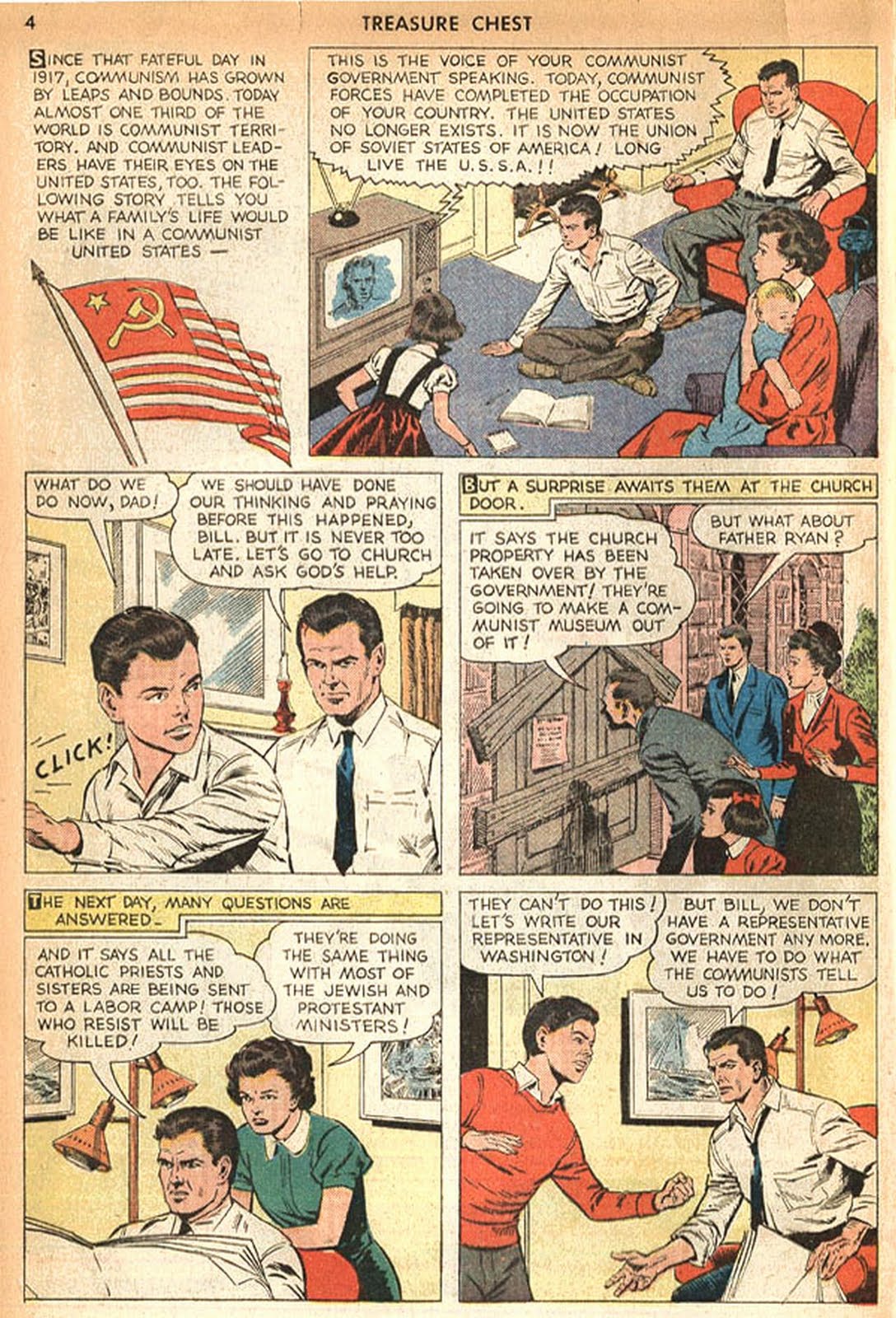 Treasure Chest was a monthly comic book published by the Catholic Guild from 1946 to 1972. Each issue featured several different stories intended to inspire citizenship, morality, and patriotism. In the 1961, volume 17 number 2 issue, the story "This Godless Communism" began. It continued in the even numbered issues through number 20. The entire story is presented here.