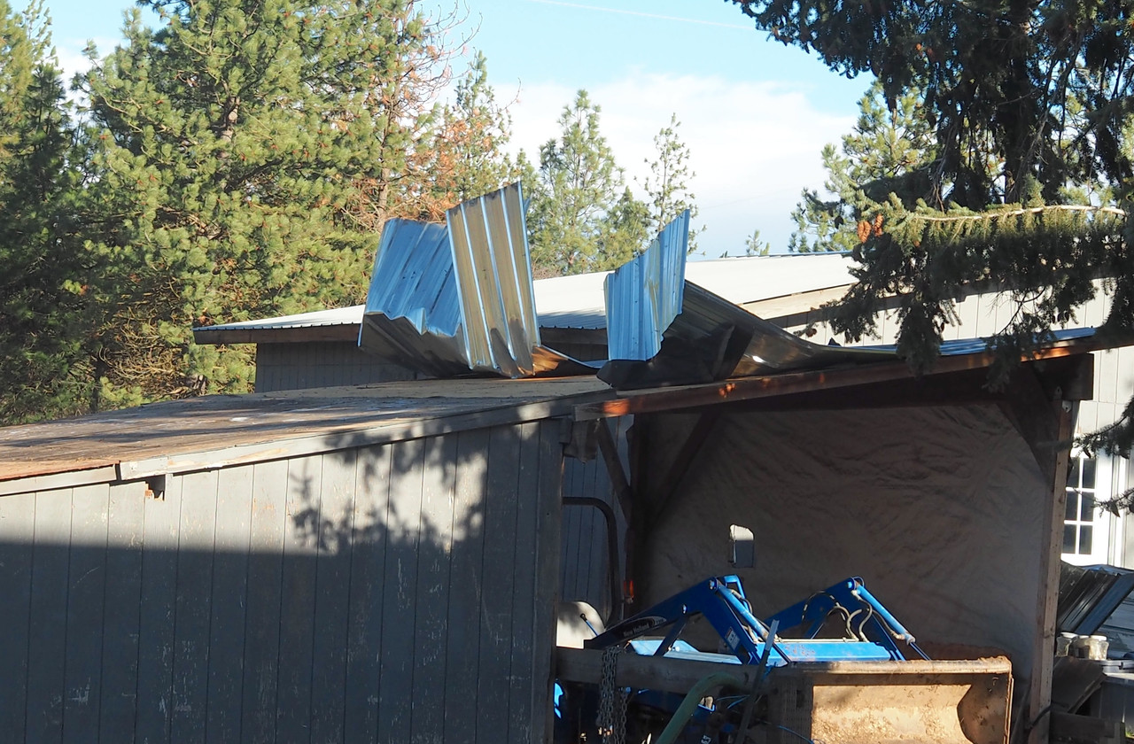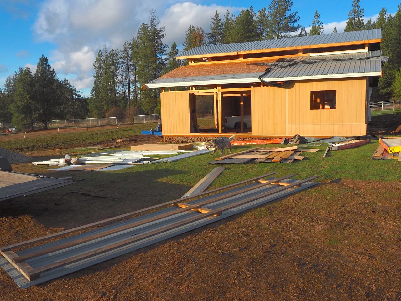 Strong winds blew through this past week. The roofing panels you see held down in the foreground were just a few of many caught up in the wind and blown all over the ground. The builders had not thought to secure them when they left for the day. Shadow's inspecting the damage.