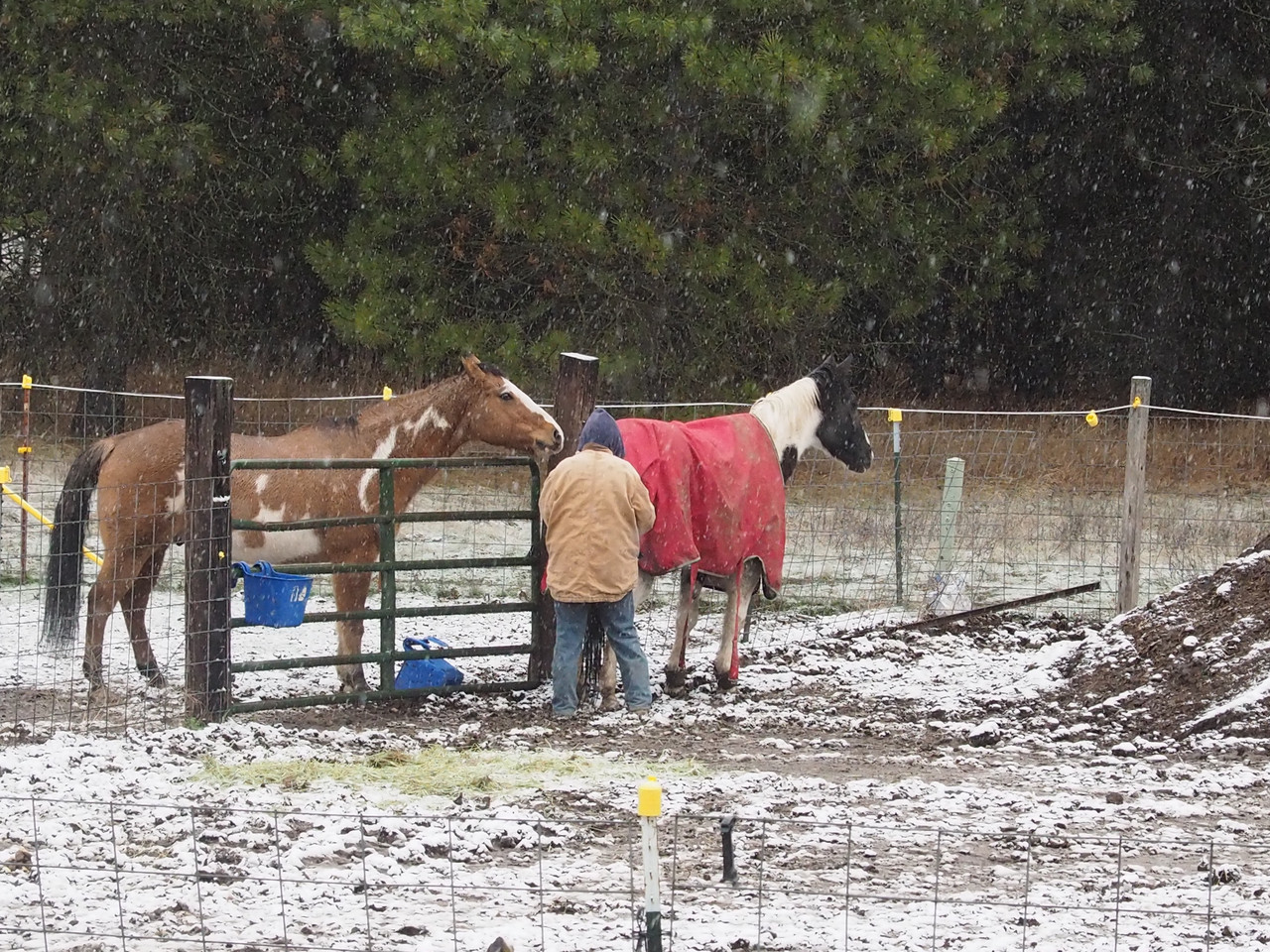 Snowed the other day. Laurie put Maddie's blanket on. Pete was there to supervise.