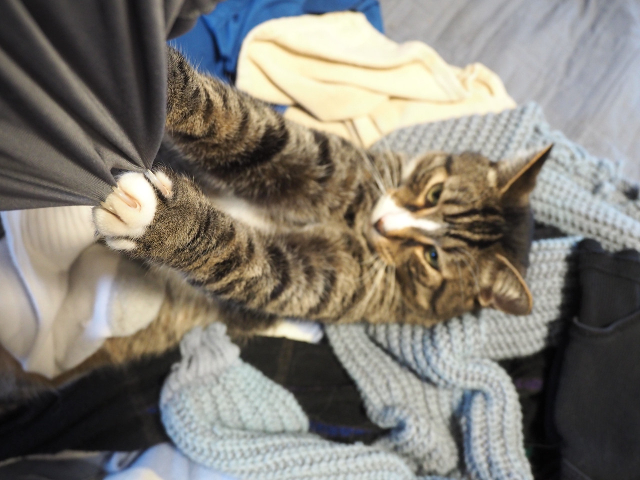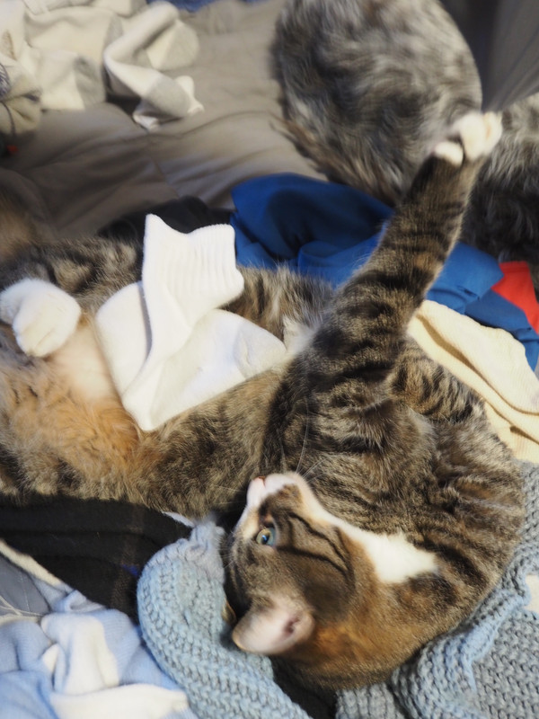 While putting laundry away Daddy teased KC with a dangling sock. KC responded.