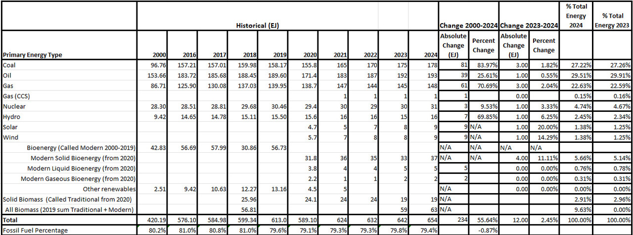 The 2025 World Energy Outlook is out, and as always, it contains tables of data of sources of energy and the amount of energy utilized, now reported in the SI unit Exajoule.