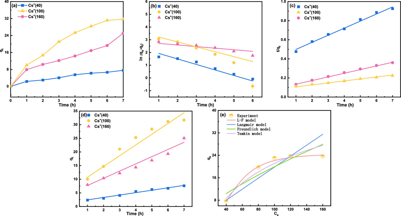 Figure 1. (a) Adsorption capacity of Ti3C2 for Cs+ at different initial concentrations (conditions: m = 0.07 g, m/V = 1.4 g·L-1, pH = 7.0, T = 298 K), (b) pseudo-first-order kinetic model, (c) pseudo-second-order kinetic model, and (d) intraparticle diffusion model for Cs+ adsorption on Ti3C2 (conditions: m = 0.07g, m/V = 1.4 g·L-1, pH = 7.0, T = 298 K), and (e) adsorption isotherms for Cs+ adsorption on Ti3C2 (conditions: m = 0.07 g, m/V = 1.4 g·L-1, pH = 7.0, T = 298 K, t = 7 h).