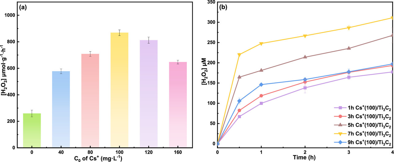 Figure 8. (a) H2O2 productivity over Ti3C2 after 0.5 h of Cs+ adsorption with different initial concentrations (conditions: 300 W Xe lamp, 0.025 g photocatalyst, 50 mL seawater, 0 °C, 0.5 h); (b) time-dependent photocatalytic H2O2 production over Cs+(100)/Ti3C2 under different adsorption times for Cs+ (conditions: 300 W Xe lamp, 0.025 g photocatalyst, 50 mL seawater, 0 °C).