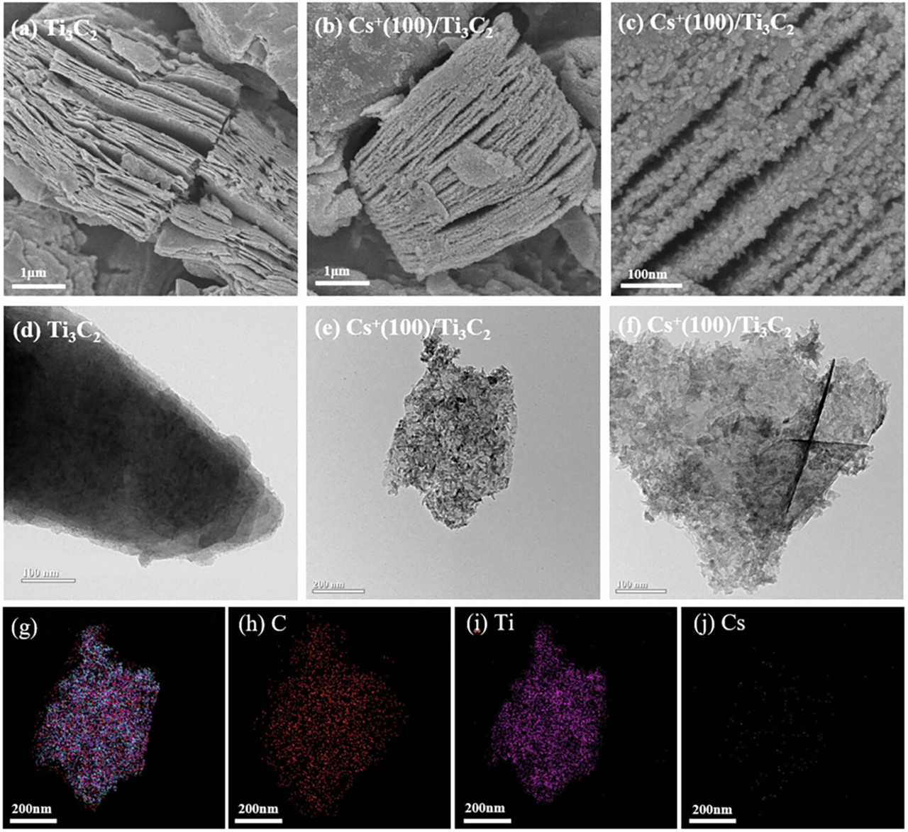 Figure 3. SEM images of (a) Ti3C2 and (b, c) Cs+(100)/Ti3C2; TEM images of (d) Ti3C2 and (e, f) Cs+(100)/Ti3C2; TEM elemental mapping images of (g) overall distribution of (h) C, (i) Ti, and (j) Cs.